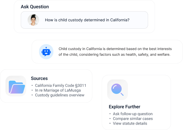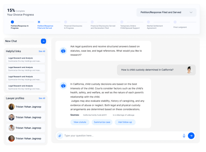 Divorcelift.ai helps you navigate complex legal questions by delivering clear answers supported by relevant statutes, case law, and legal references.